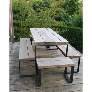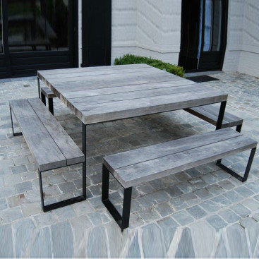 mesa quadrada e bancos em aluminío pintado e ripas de ipê maciço