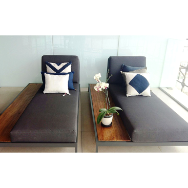 Espreguiçadeira dupla em alumínio pintado com deck em madeira e estofado em tecido impermeável